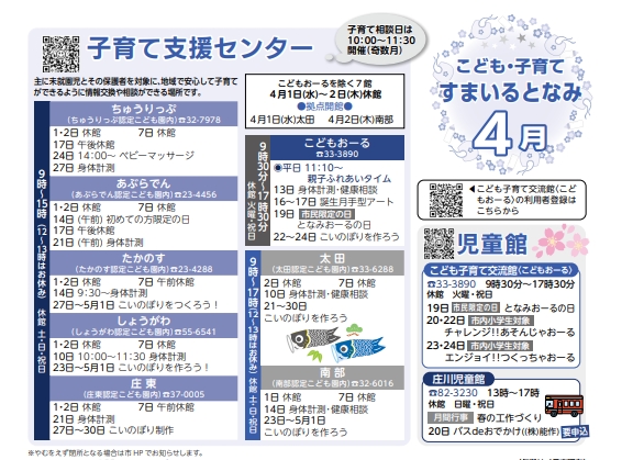 4月2日は拠点として南部子育て支援センターが午前9時から午後3時開館します。