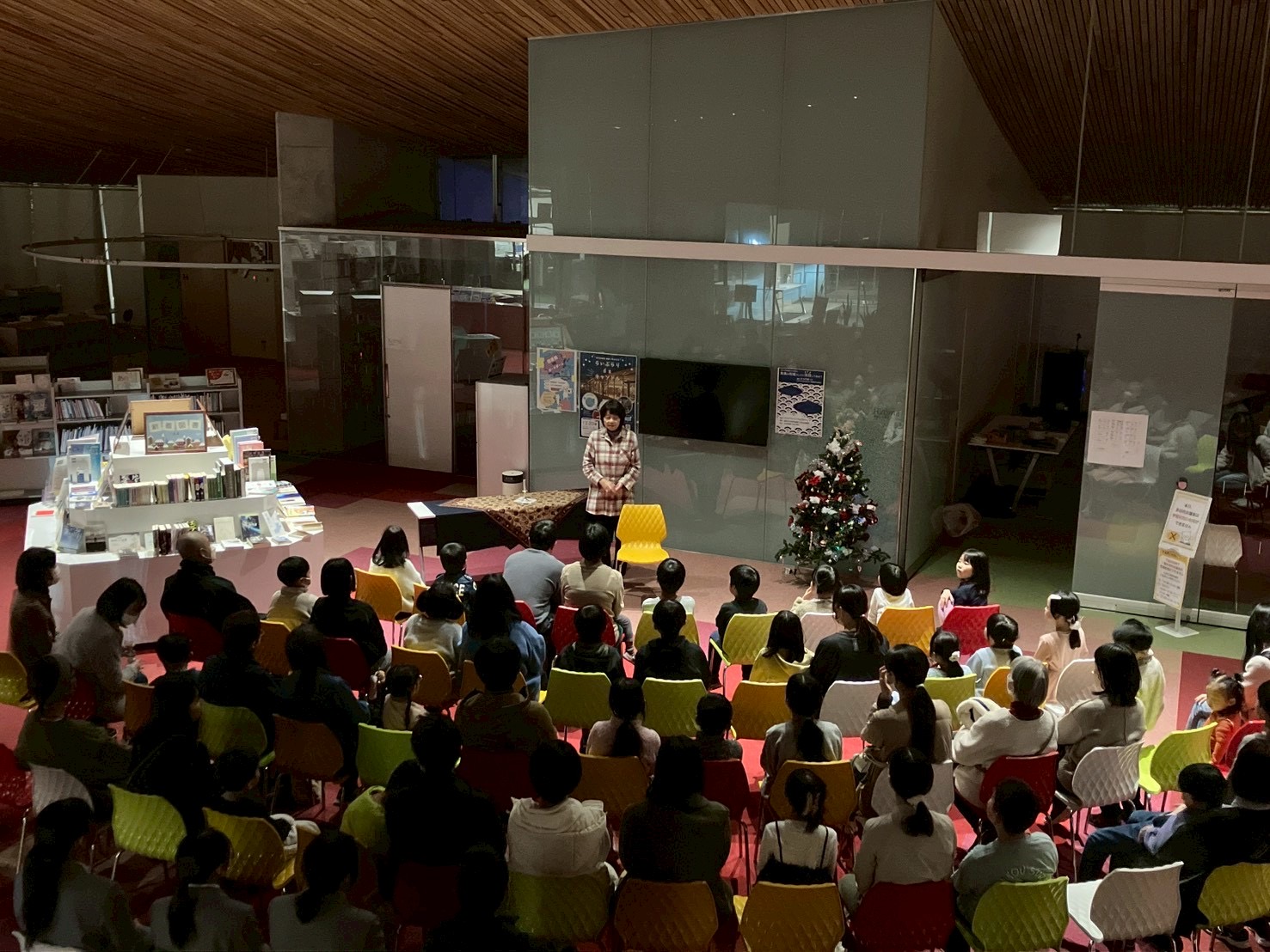 本日砺波ファーストブックの会さんによる「えほんのじかん」が、クリスマススペシャルで開催されました!今回はいつものおはなしのへやから、広い多目的会議室での行われ、参加者も30人を超えるほどにお集まりいただきました。 「はじ...