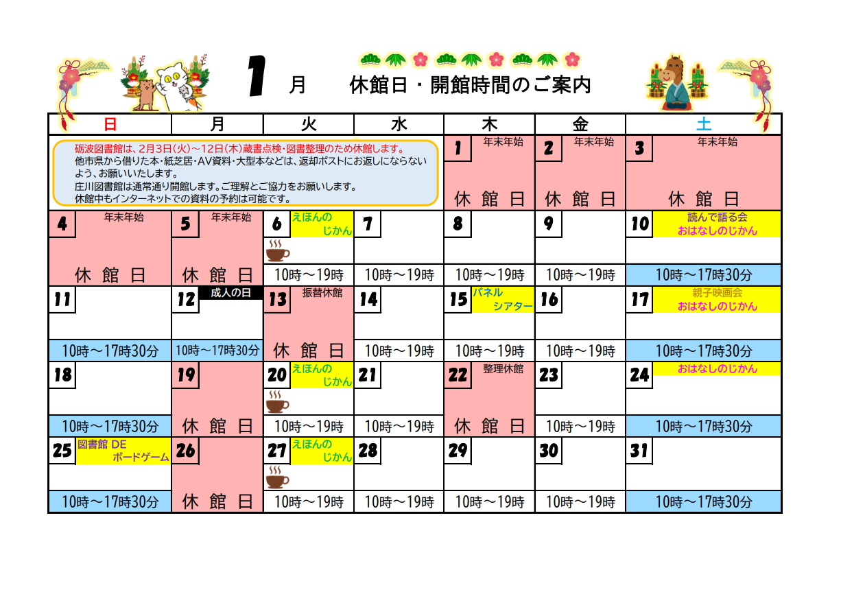 砺波図書館2026年1月のカレンダー