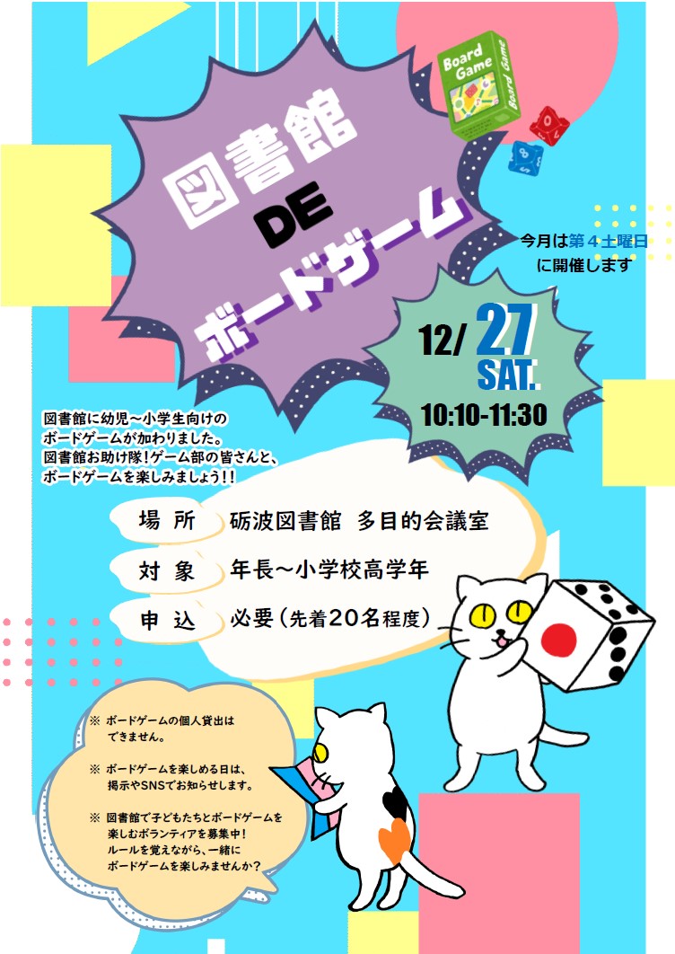 ★12月は第4土曜日に開催します★図書館 DE ボードゲーム 日 時:12/27(土)10時10分~11時30分場 所:砺波図書館 多目的会議室参加費:無料対 象:年長~小学校高学年申 込:必要(先着20名程度) 12月...
