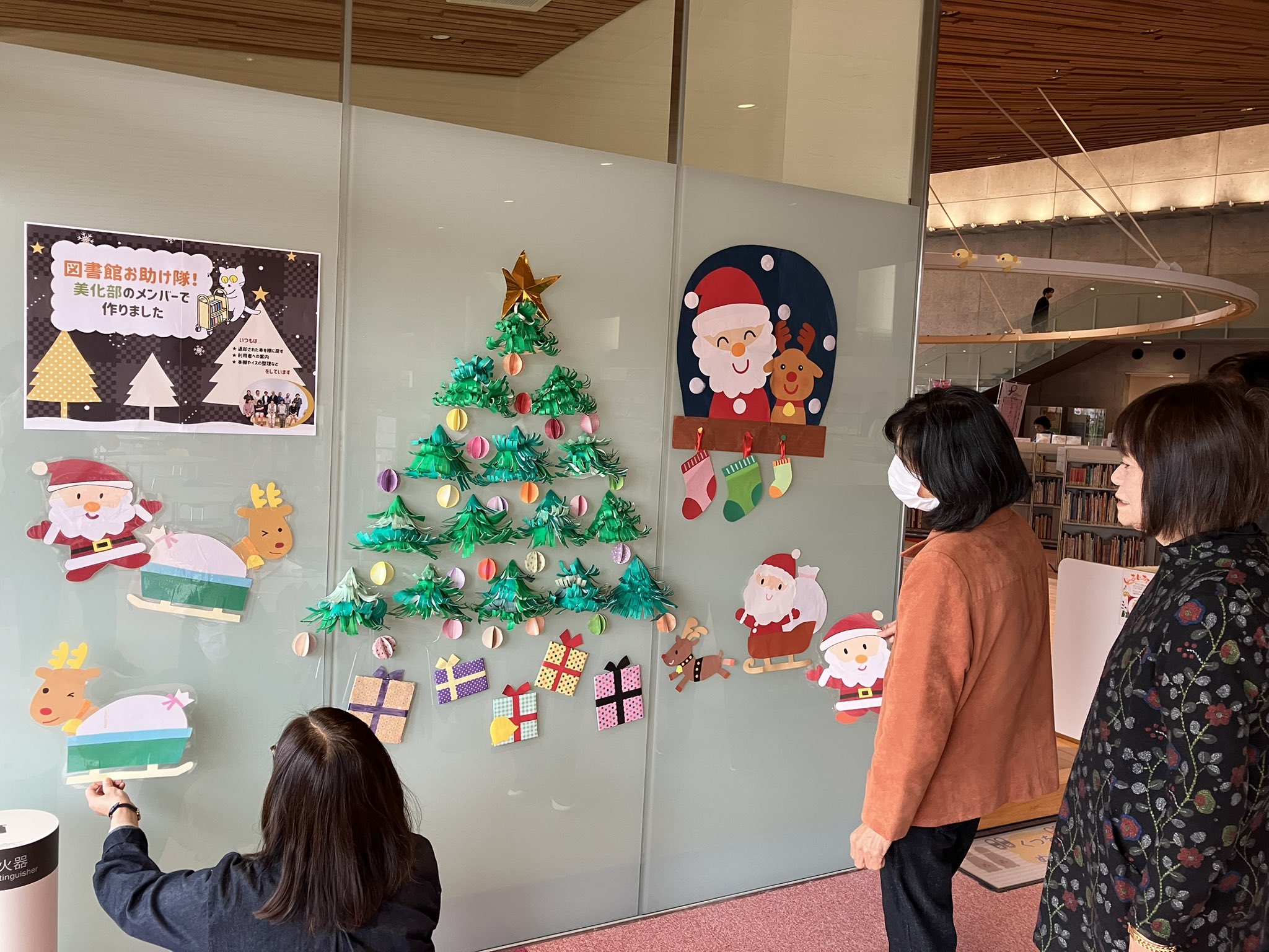 図書館お助け隊!美化部のメンバーで、クリスマス飾りを作りました。1階おはなしのへや横の壁に飾ってありますので、見にきてくださいね🎄