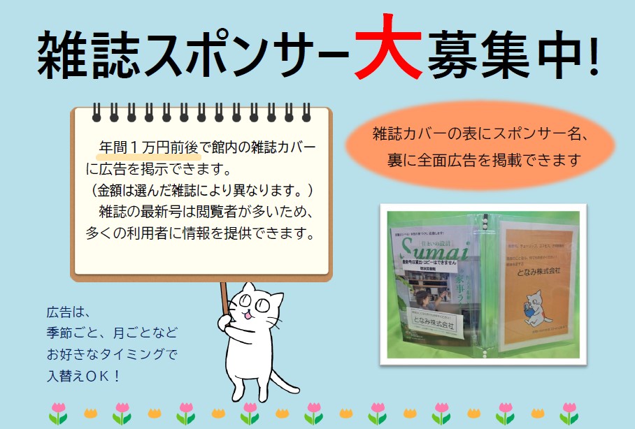 令和8年度砺波市立図書館 雑誌スポンサー を募集します。 図書館であなたの企業をPRできます(砺波市HPへリンクします) 雑誌スポンサー制度とは…雑誌スポンサーの方に、雑誌の年間購入代金をご負担いただ...