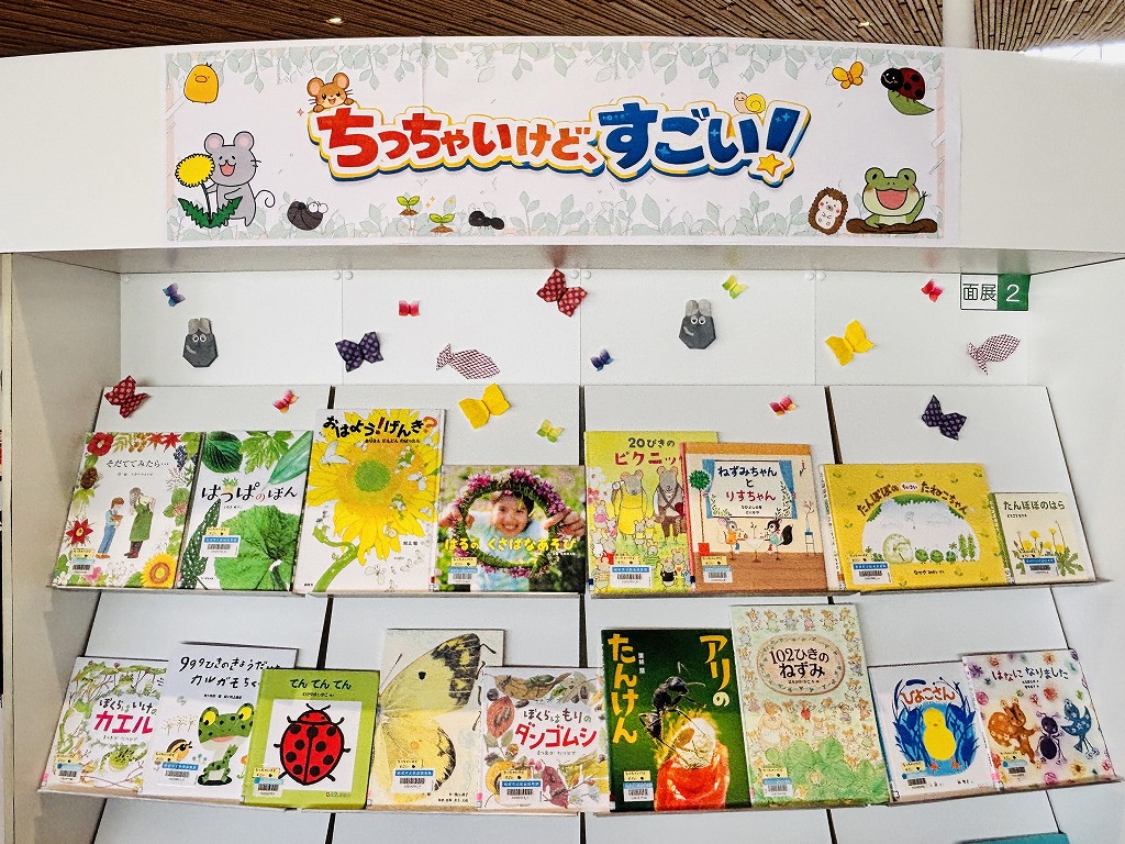 児童向けの新しい企画テーマは「ちっちゃいけど、すごい!」です。 虫やカエル、ネズミや小鳥など、小さくても頑張ってる生き物たちの絵本を展示します。小さな体に潜む大きなパワーから、元気をもらえる展示です。