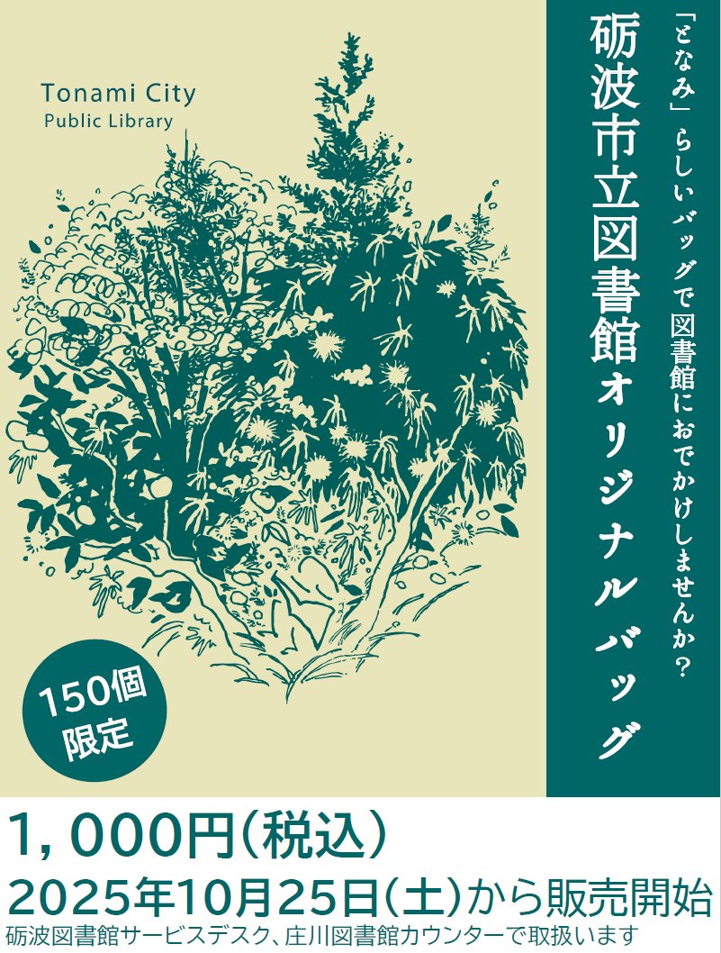 砺波市立図書館友の会では砺波図書館移転開館5周年を盛り上げるため、オリジナルバッグを制作しました。 1つ1,000円(税込)、150個限定です。砺波・庄川図書館で10月25日から販売します!