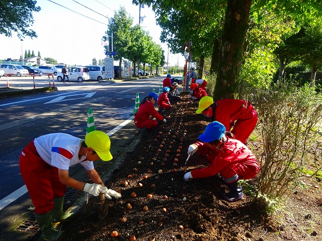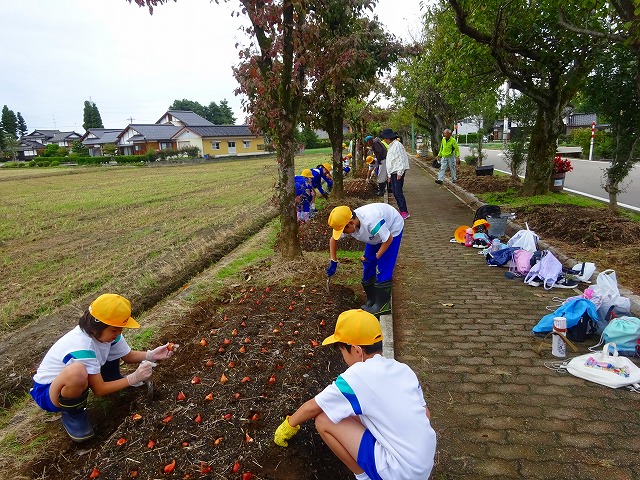 今日植え込みのチューリップはレッドプラウド4800球だよ! 植え込み方はシャベルの持ち方から教えてもらったね! 球根を持ってシャベルがかくれるまでさして、手前に引いて、できた穴に球根を入れて、土をかぶせてね! 畝の両側か...
