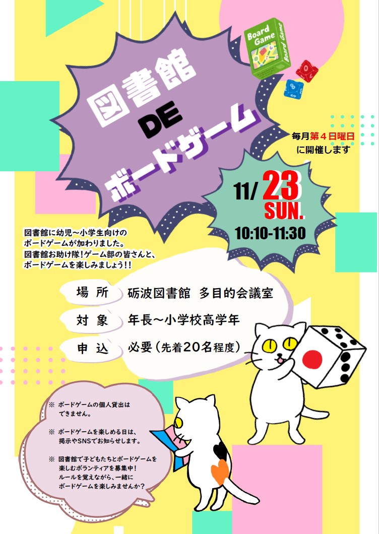 図書館 DE ボードゲーム 日 時:11/23(日)10時10分~11時30分場 所:砺波図書館 多目的会議室参加費:無料対 象:年長~小学校高学年申 込:必要(先着20名程度) 11月の「図書館 DE ボードゲーム」を...