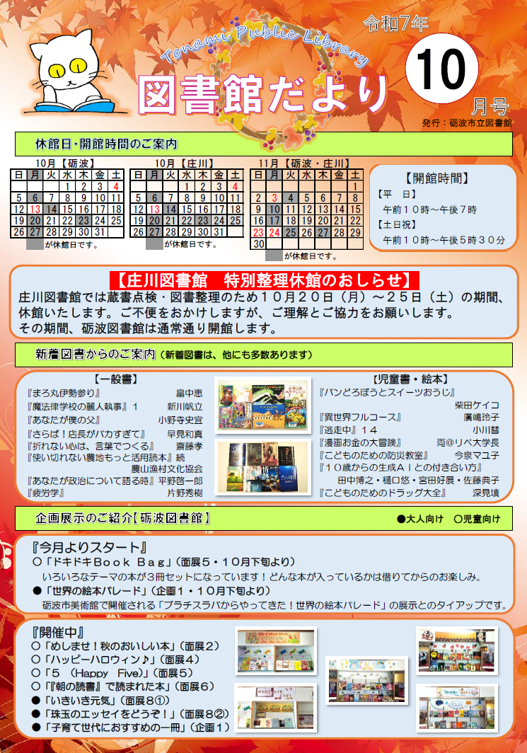 図書館だより10月号を発行しました!サービスデスクなどに置いてありますので、開館日や、イベントの予定をチェックしてみてください♪ ♦らんぷの会 朗読会♦ 日 時:10月18日(土)午後1時30分~(約90分間)場 所:砺...