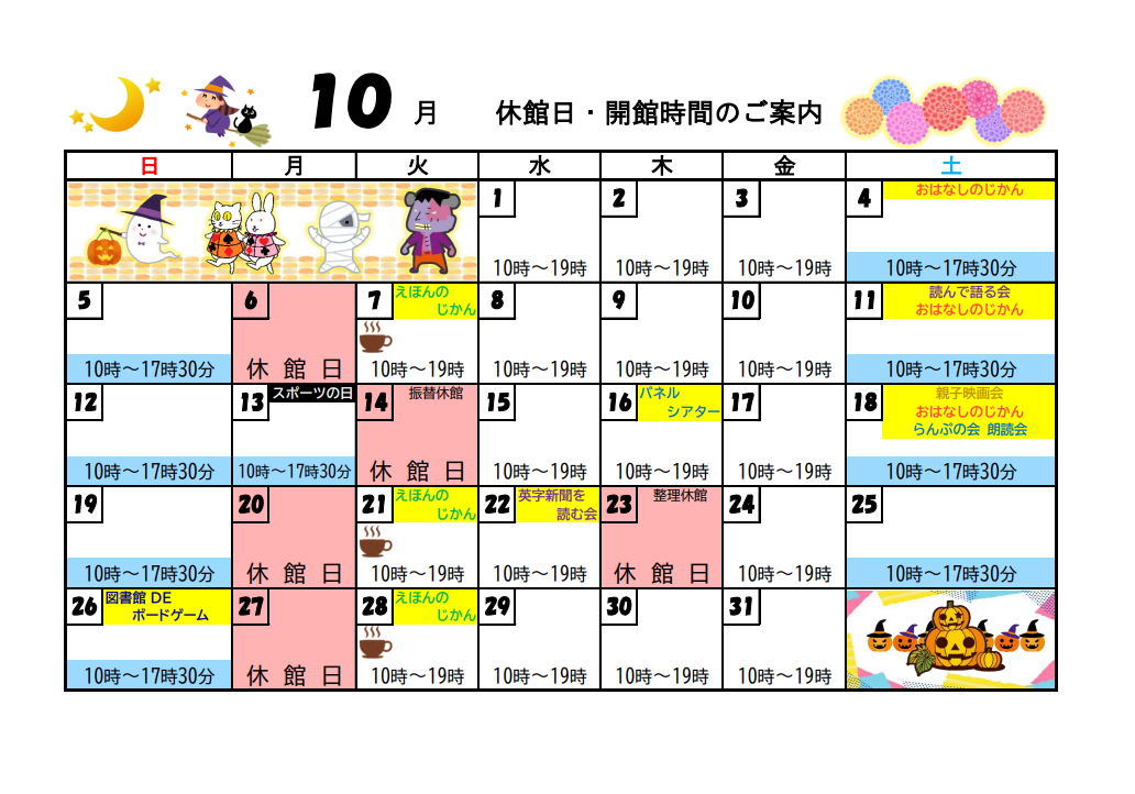 図書館の開館カレンダーは、PCやスマホからも確認できます♪⇒コチラ借りている本の確認や延長手続き、インターネット予約もできますよ(^^) ☆☆イベント☆☆ ♦らんぷの会 朗読会♦ 日 時:10月18日(土)午後1時30分...