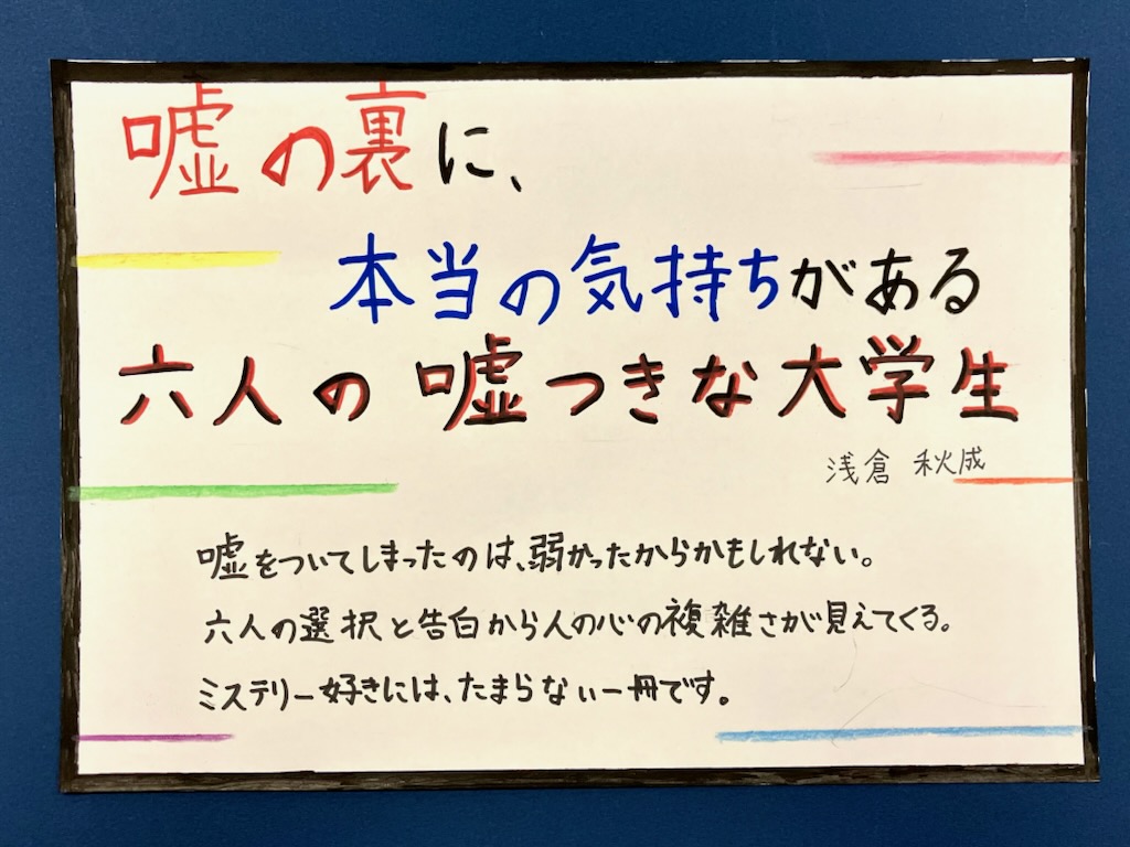 - 2025年11月の活動で作成したPOPを紹介します。【広報部】が11月の活動で作成したPOPを紹介します! POPとは、魅力を伝えるメッセージカードのこと♪ POPは、砺波図書館の本棚「面展8」にあります。ぜひ、見てみてください。 広報部では、「新しい本と出合うきっかけに…