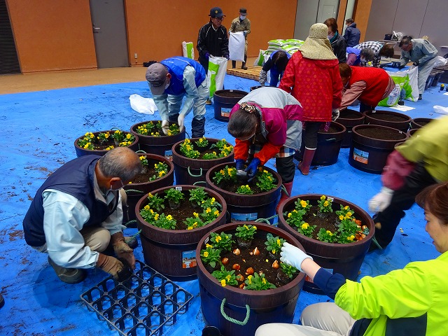 各地区の皆さんに午前と午後に分かれて、プランターの植え込み作業に協力していただきました。 午前の部のあいさつから 作業の説明を聞いていただいて まず、かさ上げ用の発泡スチロールの袋詰め作業から 花さじき用のプランターはと...