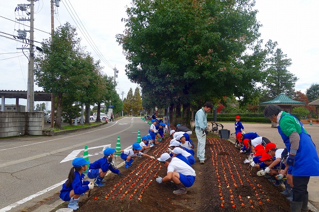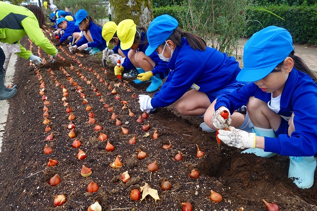 3つのグループに分かれて植え込み方の説明を聞いたね!チューリップは黄色い「ムスカデット」