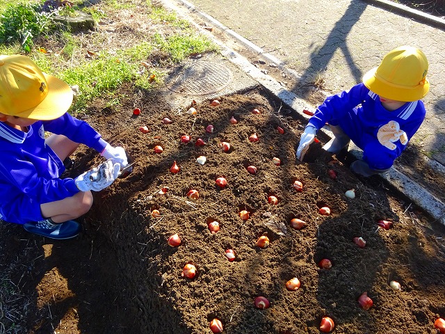 球根を並べるところから作業開始だよ♪皮がむけても大丈夫だよ!
