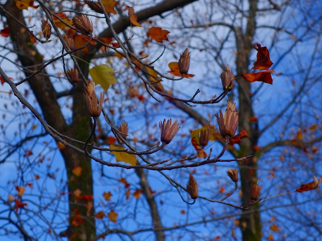 チューリップ四季彩館の前のユリノキは葉が落ちて、種がたくさん残っているよ!