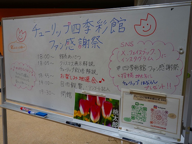 最後にアンケートの記入と、チューリップ四季彩館の公式SNSをフォローしていただいて、#四季彩館ファン感謝祭をつけて投稿していただいた方にプレゼントを贈ったよ!