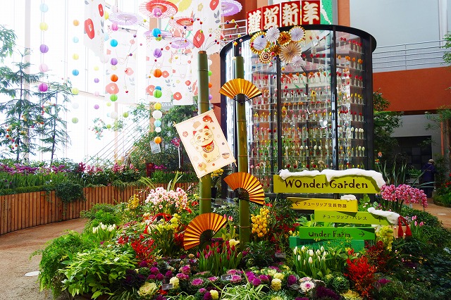 2025年1月4日(土)~1月27日(月) 「新春の庭」 促成栽培のチューリップとシンビジウムと縁起物植物のセンリョウ、マンリョウ、ハボタンなどを展示したよ♪扇子や和傘などの装飾でお正月ムード満点だったよ!