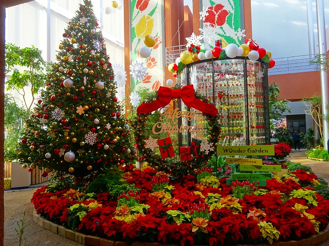 2025年11月7日(金)~12月26日(金) 「冬の庭・クリスマス」 抑制栽培のチューリップと伝統的な赤、金、緑、白色のオーナメントで飾られたクリスマスツリーで、楽しいクリスマスの雰囲気だったよ!