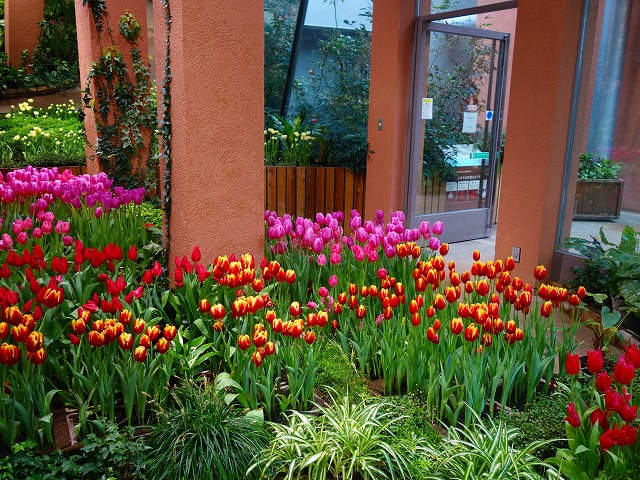 促成栽培で咲かせたチューリップ5000本とプリムラ類やアネモネ、ラナンキュラス、スイセンなどの球根植物が咲いているよ!