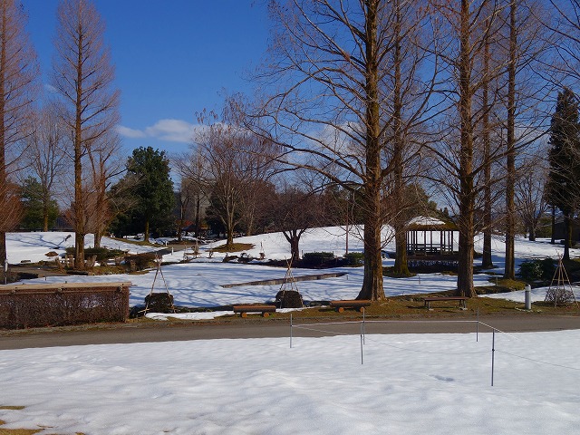 噴水周り花壇は半分くらい!青空ときらきら光る白い雪がきれいだね~!