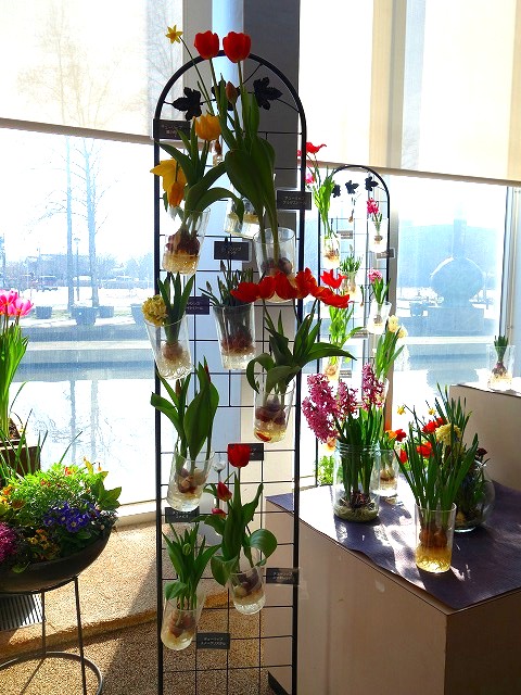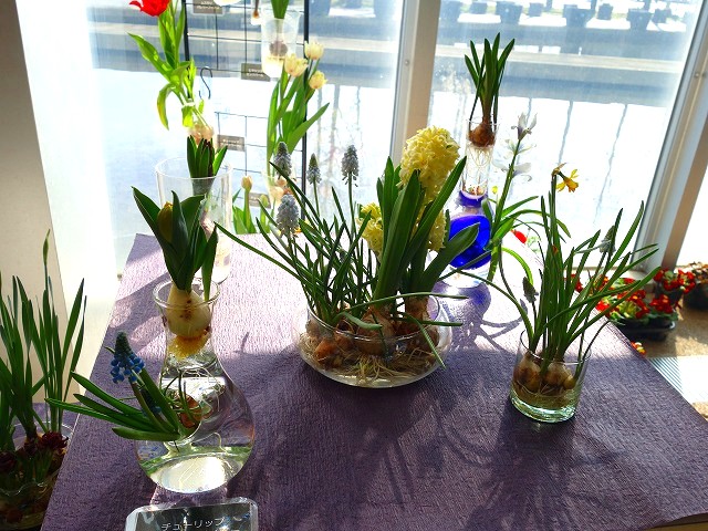 企画展の水耕栽培のチューリップ、ヒヤシンス、ムスカリも見ごろだよ!