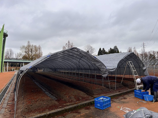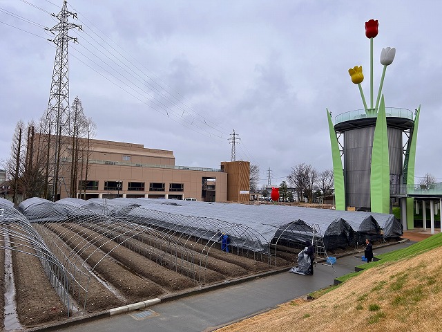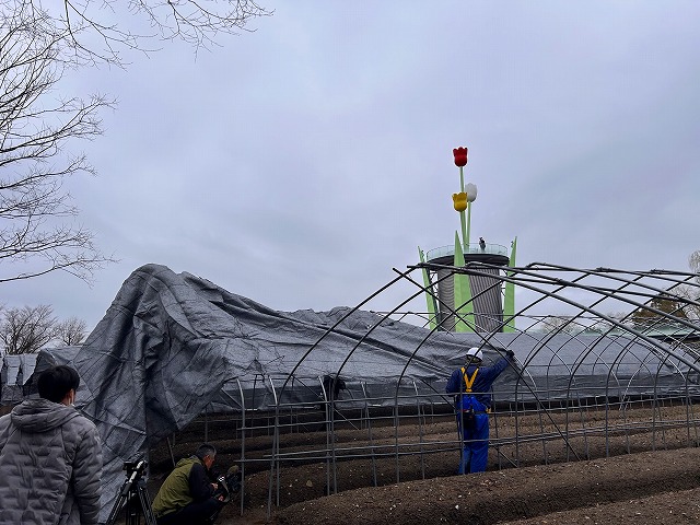 チューリップ公園では、チューリップの開花調整のための遮光ネットの被覆作業が2月26日(木)から始まったよ!