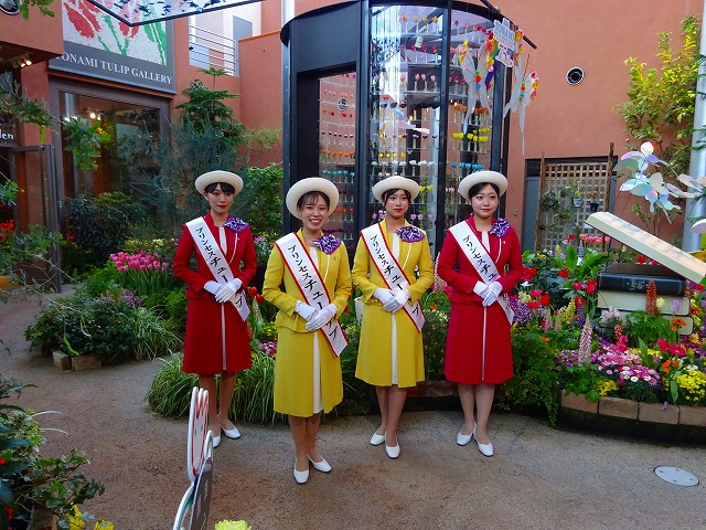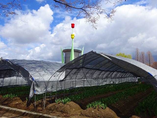 チューリップ公園の花壇は、開花調整のために遮光ネットで覆われているよ!