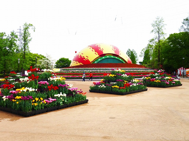 南門のチューリップピラミッドは夕べ入れ替え作業が行われたよ!