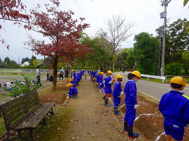 シャベルが全部隠れるほど土にさして、引いて、球根を入れて、土をかける!4つの工程だったね(*^^*)