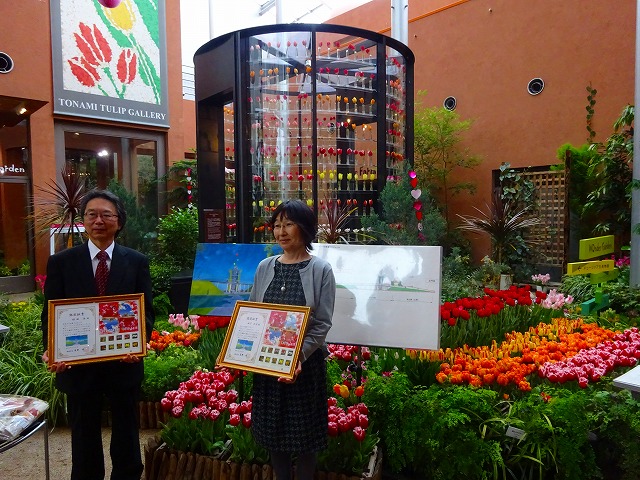 坂下知子様と堀田浩様のお二人にチューリップスカイウォーク命名者認定証書と記念品が渡されたよ♪