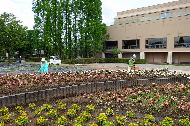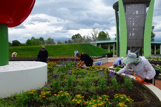 チューリップ公園の大花壇のコキアの植え込みが進んでいるよ!