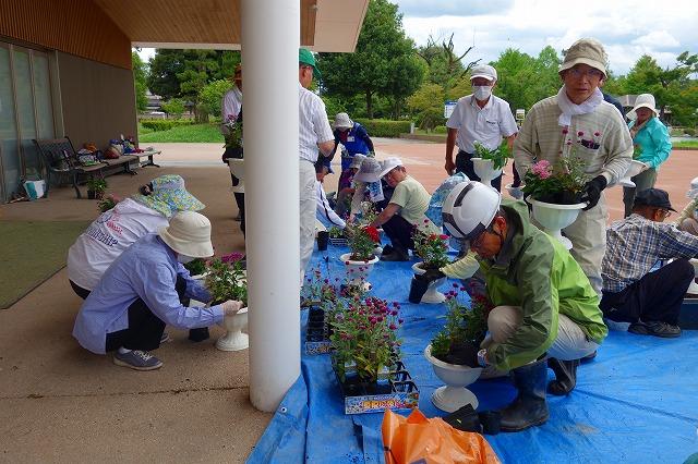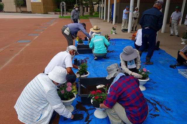 除草の後は、ペンタス、センニチコウ、ニチニチソウの寄せ植えを体験していただいたよ!