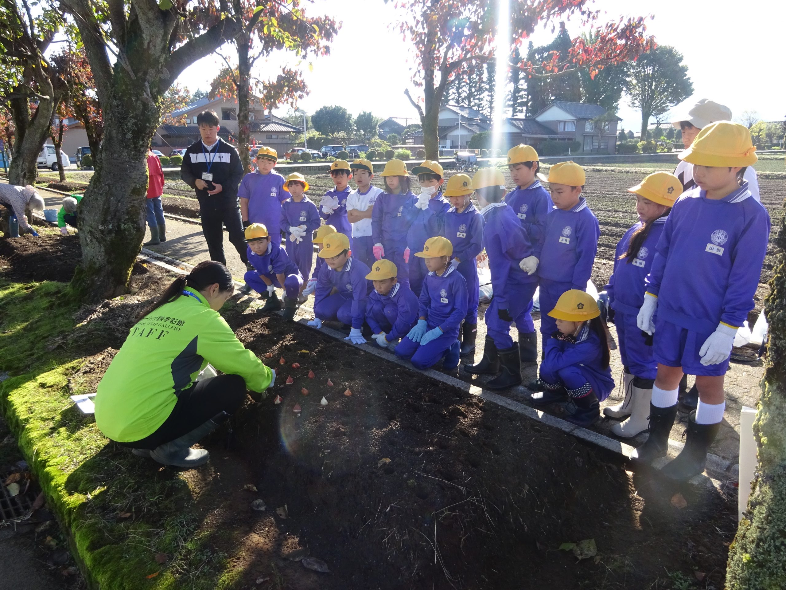 今日植え込みのチューリップはレッドプラウド4800球だよ! 植え込み方はシャベルの持ち方から教えてもらったね! 球根を持ってシャベルがかくれるまでさして、手前に引いて、できた穴に球根を入れて、土をかぶせてね! 畝の両側か...