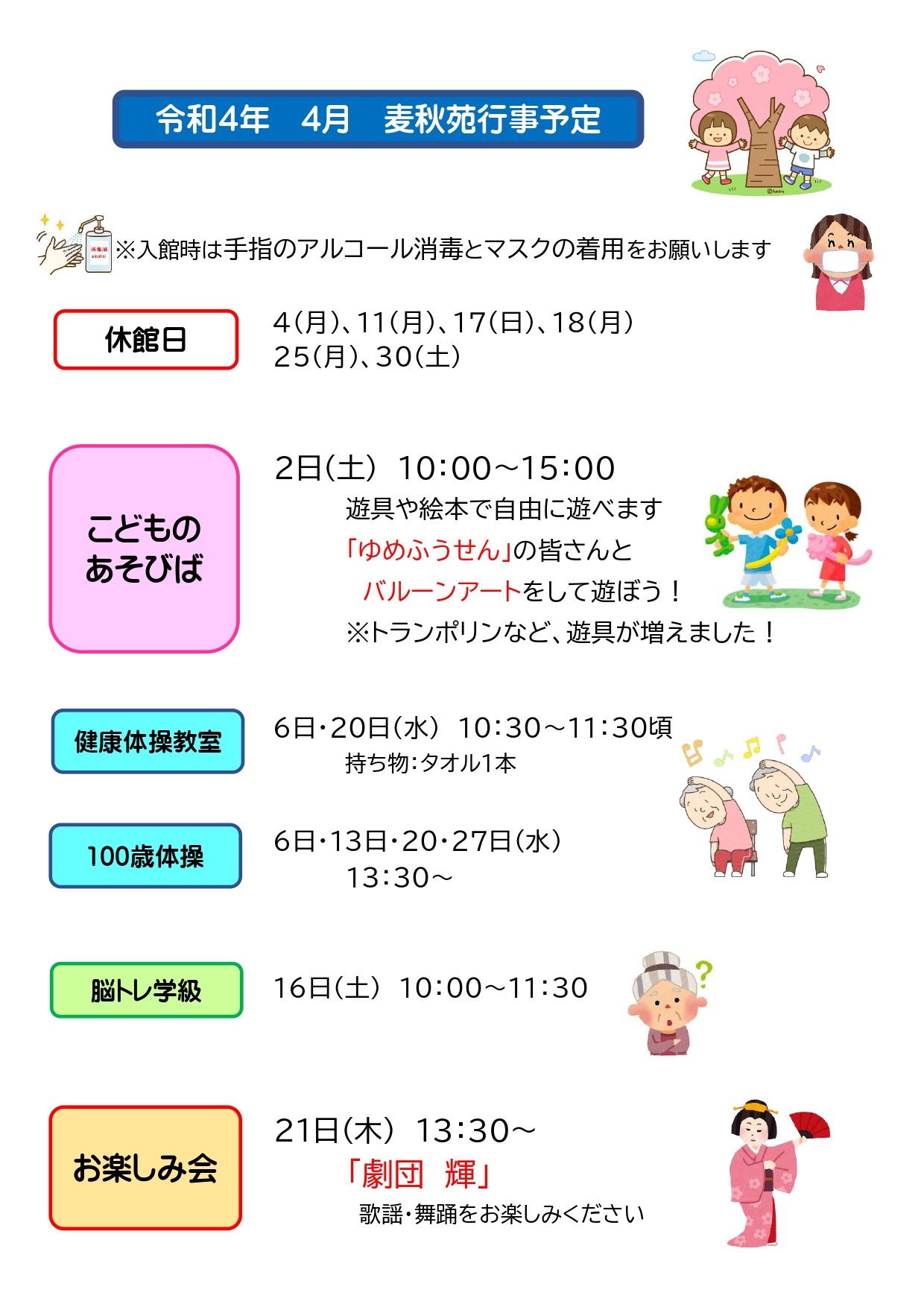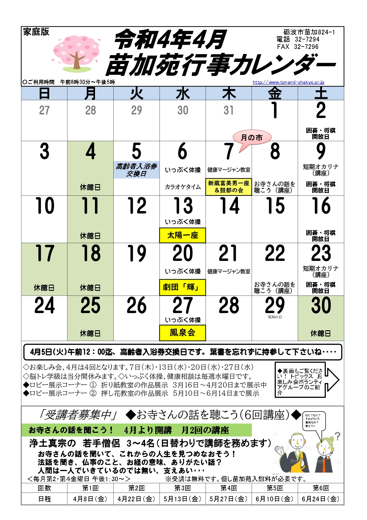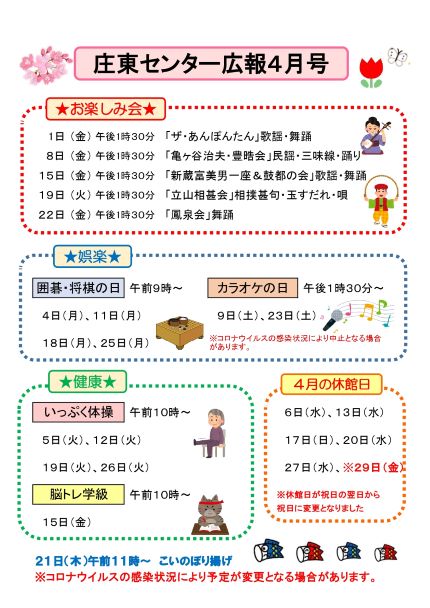 苗加苑、北部苑、麦秋苑、庄東センターの4月の行事予定をお知らせします。