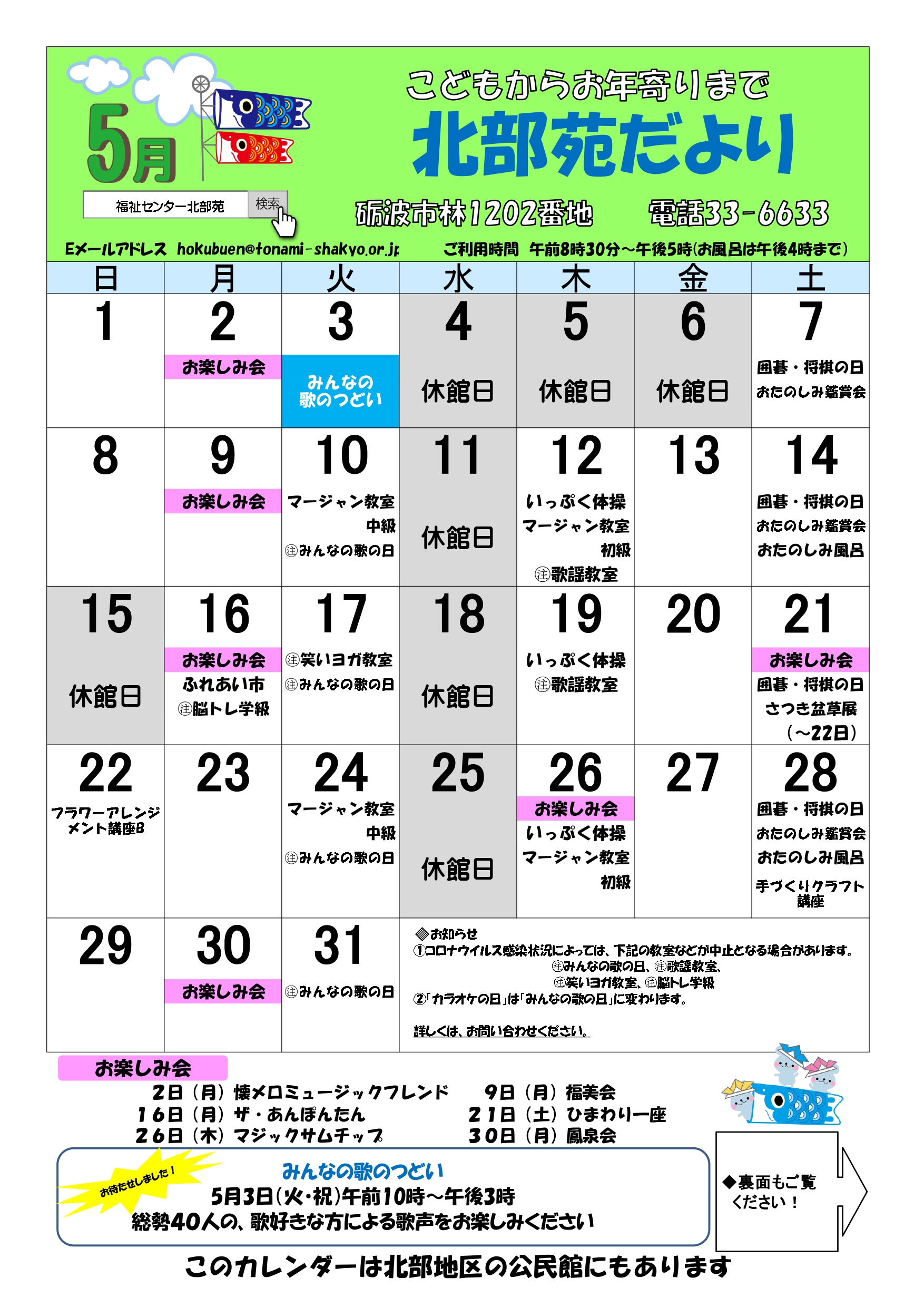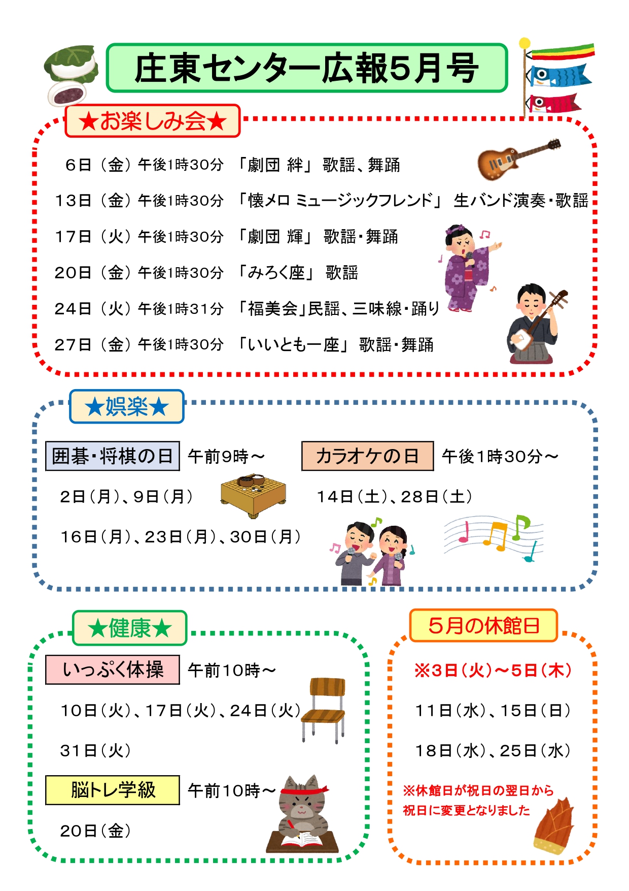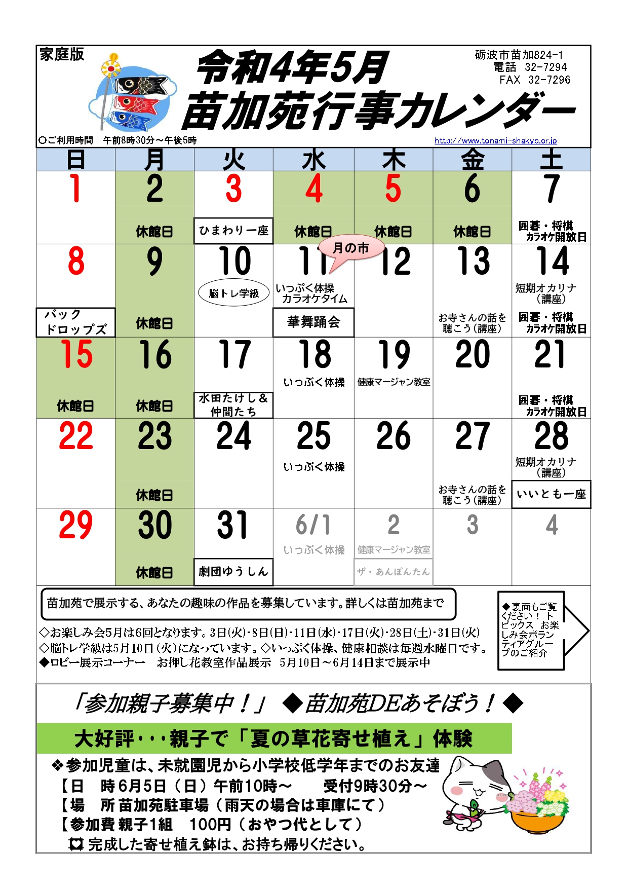 ゆーりっぷの部屋 【お知らせ】福祉センター5月の行事予定 2022年04月25日 17:35 行事開催案内 苗加苑、北部苑、麦秋苑、庄東センターの5月の行事予定をお知らせします。 詳細は、各センターのホームページをご確認ください。 苗加苑のHP 北部苑のHP 麦秋苑のHP 庄東センターのHP ツイート 前の記事次の記事