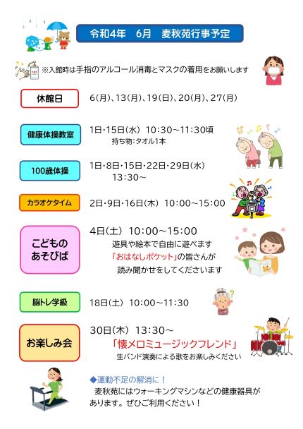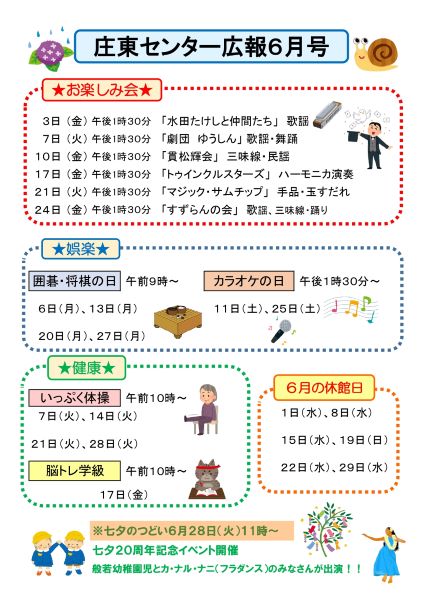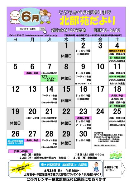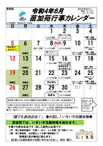 苗加苑、北部苑、麦秋苑、庄東センターの6月の行事予定をお知らせします。
