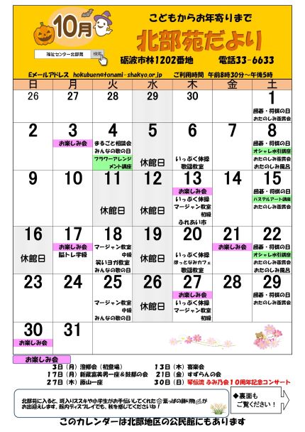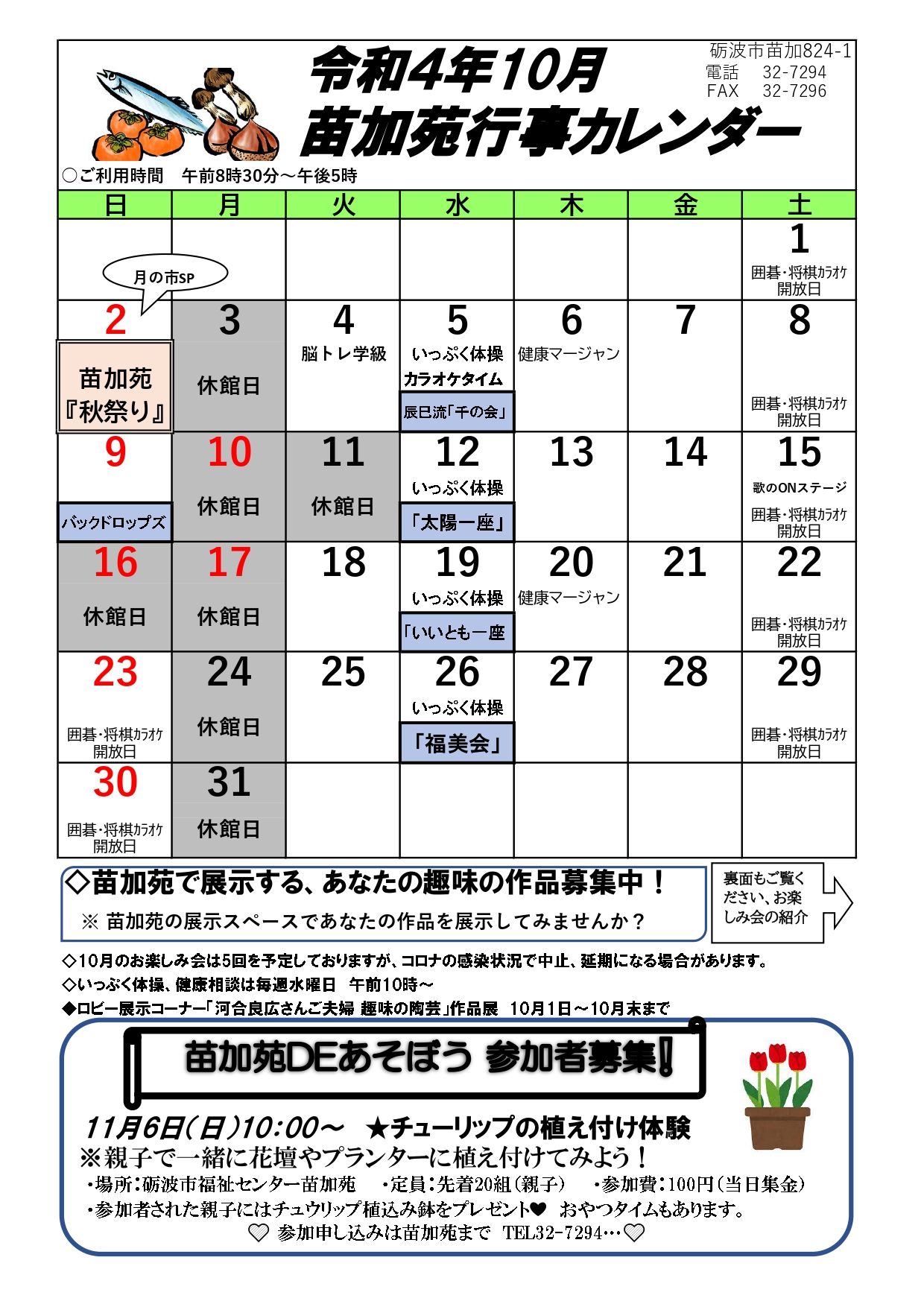 ゆーりっぷの部屋 【お知らせ】福祉センター10月の行事予定 2022年09月28日 16:50 行事開催案内 苗加苑、北部苑、麦秋苑、庄東センターの10月の行事予定をお知らせします。 詳細は、各センターのホームページをご確認ください。 苗加苑のHP 北部苑のHP 麦秋苑のHP 庄東センターのHP ツイート 前の記事次の記事