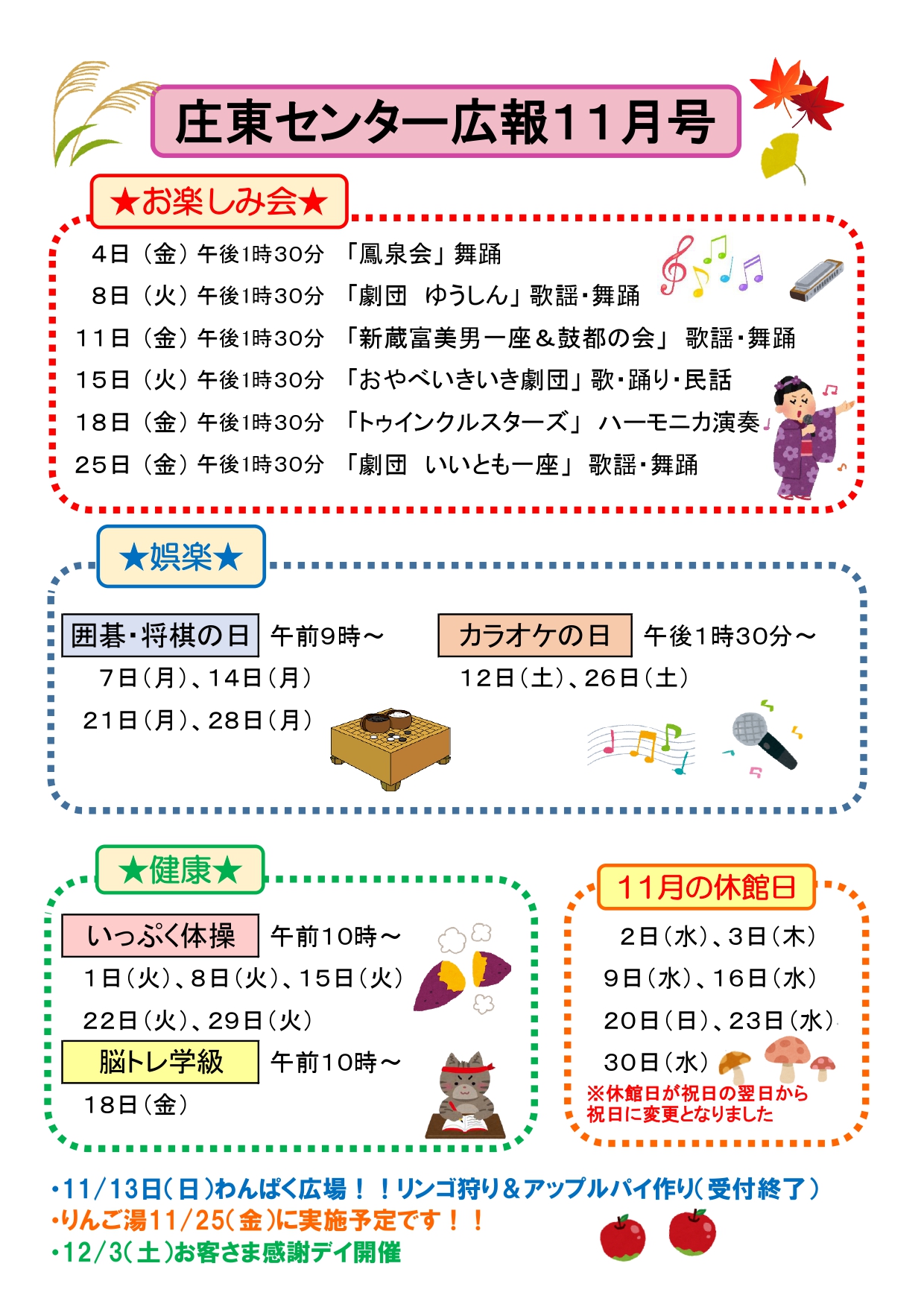 苗加苑、北部苑、麦秋苑、庄東センターの11月の行事予定をお知らせします。