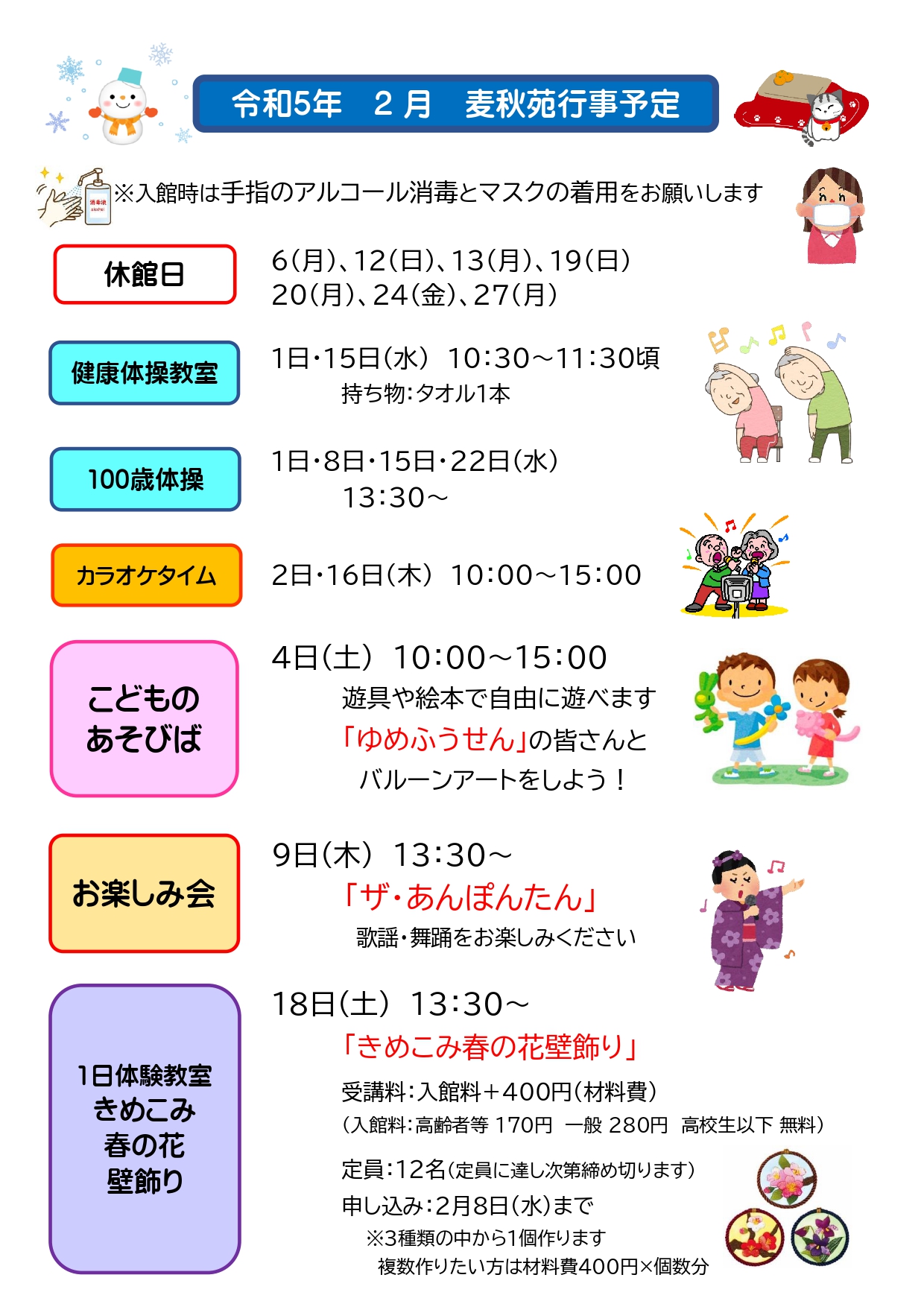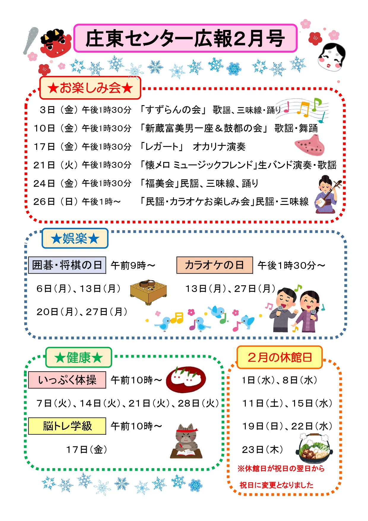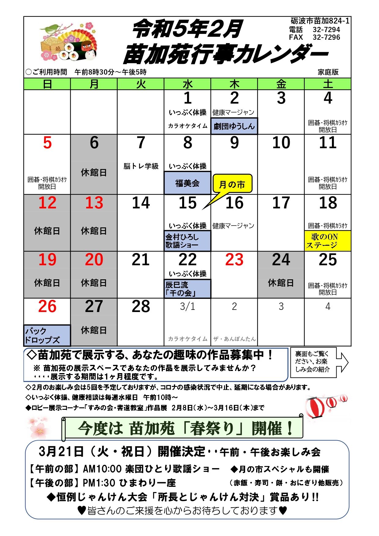 苗加苑、北部苑、麦秋苑、庄東センターの2月の行事予定をお知らせします。