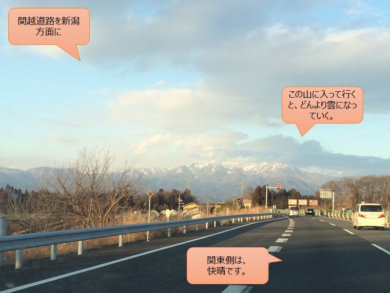 高速道路で関越道路を走りましたが、群馬の山を境に天候が一変します。日本海側と太平洋側の天気の差をすごく感じられました。面白いですね。