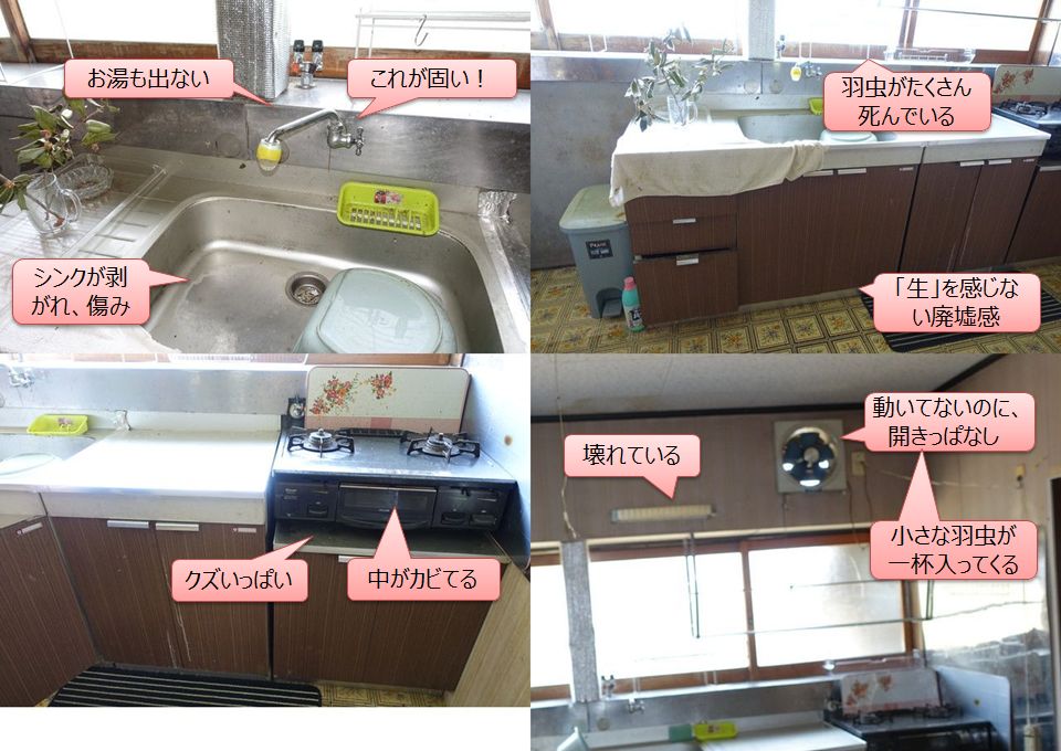 シンクの傷みがひどくて、蛇口も固くて回らない。換気扇のフタが開きっぱなしで小さな羽虫が大量に家の中に入っている。コンロ周りは掃除が十分にされてないので、油、クズだらけ。