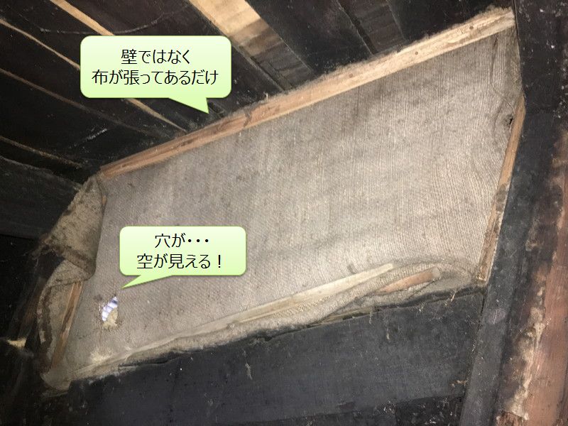 なので、再度、2階のアマを確認してみました。「ん!?」一カ所、明るい光が見える場所があるぞ!?以前は無かった筈なのに・・・丸く穴が開いていて空が見えてます。そこは、なぜか普通なら外壁(板)の筈なんですが、布が張ってあるだけです。どう見ても、ハクビシンが開けた穴ですよね?ここが通り道になってますね。