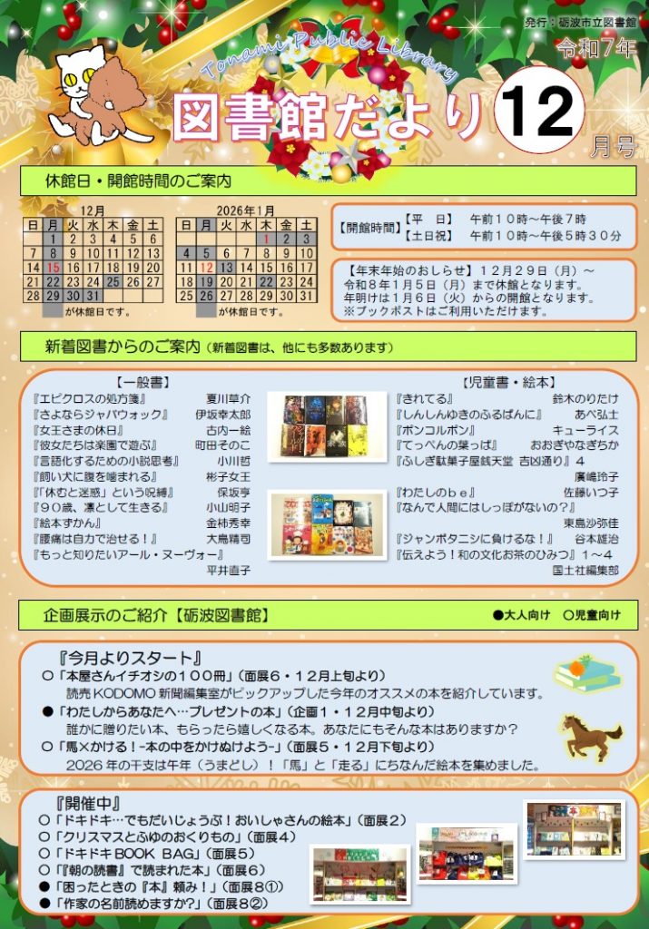 | 【日 時】12月20日(土) 午前10時10分~12時ごろ 10時10分~ 合唱クラブミニコンサート 10時50分~ お茶席(3席ほど) 【場 所】砺波図書館 エントランス 【申 込】不要 【参加費】無料 |