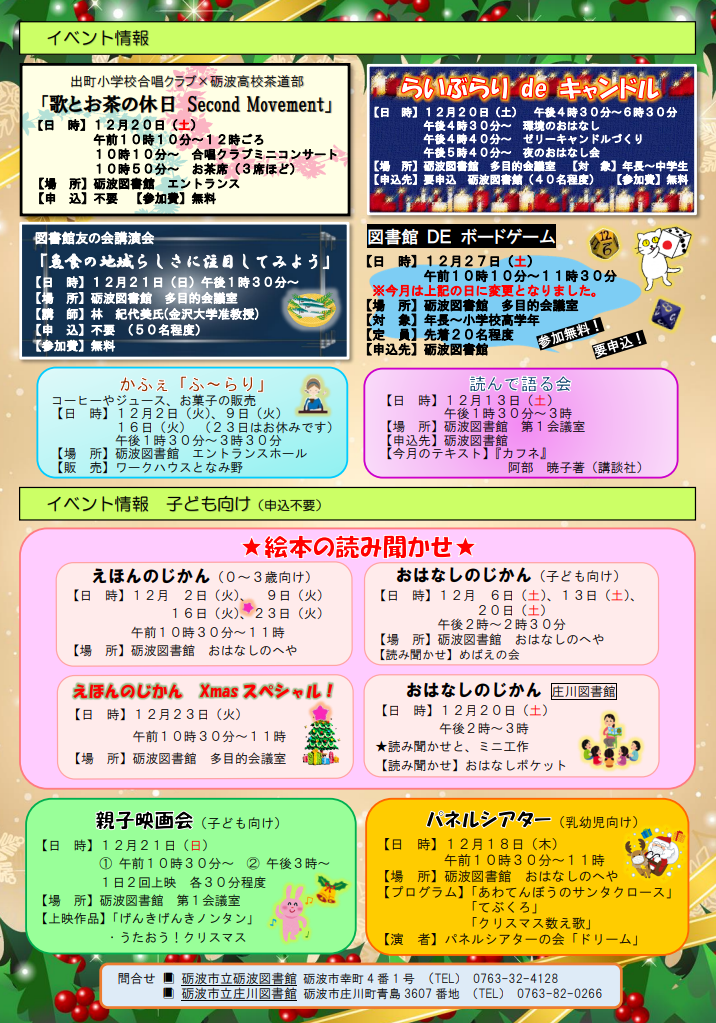 | 日 時:12月27日(土) 午前10時10分~11時30分 ※今月は上記の日に変更となりました。 場 所:砺波図書館 多目的会議室 対 象:年長~小学校高学年 申 込:必要 申込先:砺波図書館(先着20名程度) 参加費:無料 |