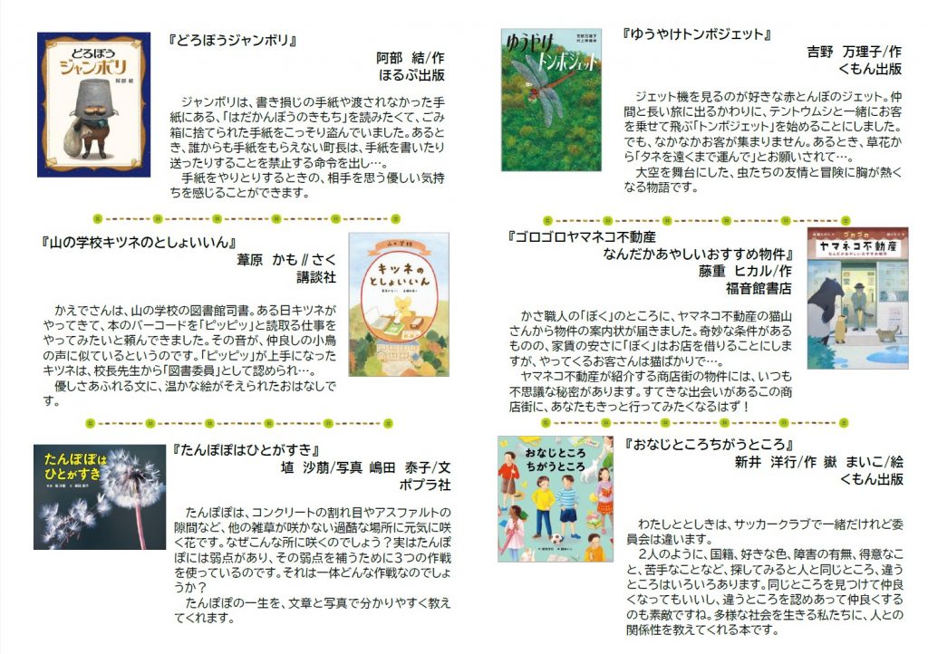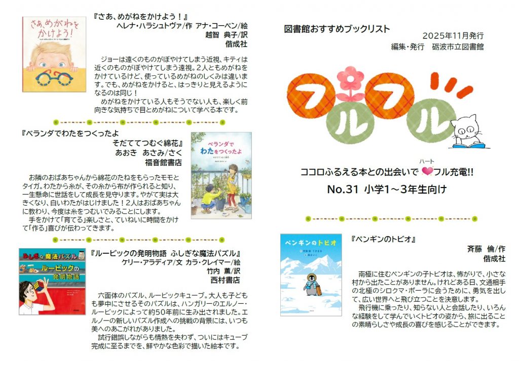 ラ・ラ・ラ・ライブラリー 砺波市立図書館 【ブックリスト】「フルフルNo.31」を発行しました! 2025年11月20日 14:34 ブックリスト【フルフル】 砺波市立図書館のおすすめブックリスト「フルフル」No.31を発行しました!「フルフル」では、砺波市立図書館のスタッフが、「ココロふるえる本」を年代別におすすめしています(^^)No.31は「小学1~3年生向け」として10冊選んでみました。砺波図書館では、雑誌や企画コーナーを展開しているS字書架で、これまで「フルフル」でおすすめした本を借りていただくことができますよ♪またPDF版でもご覧いただける他、蔵書検索HPの「テーマ別検索」にも対象年齢別のリストがあります。ぜひチェックしてみてくださいね! 関連リンク フルフル No.31 小学1~3年生向け ツイート 前の記事次の記事
