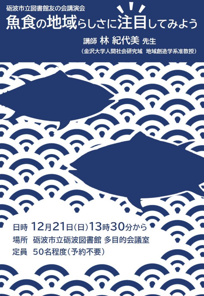 ラ・ラ・ラ・ライブラリー 砺波市立図書館 【イベント】12/21(日)図書館友の会講演会「魚食の地域らしさに注目してみよう」を開催します 2025年12月04日 16:58 イベント案内 砺波市立図書館友の会 講演会「魚食の地域らしさに注目してみよう」日 時 : 令和7年12月21日(日)午後1時30分~会 場 : 砺波市立砺波図書館 多目的会議室申 込 : 不要(50名程度)参加費 : 無料講 師 : 林 紀代美 先生(金沢大学 人間社会研究域 地域創造学系 准教授)※友の会会員の方以外も参加していただけます。 図書館友の会主催の講演会が開催されますのでお知らせします。図書館友の会会員以外の方も参加していただけます。お気軽にお越しください。 ツイート 前の記事次の記事