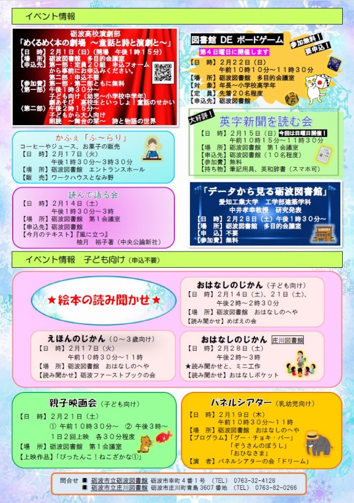 | 日 時:2月22日(日) 午前10時10分~11時30分 場 所:砺波図書館 多目的会議室 対 象:年長~小学校高学年 申 込:必要 申込先:砺波図書館(先着20名程度) 参加費:無料 |