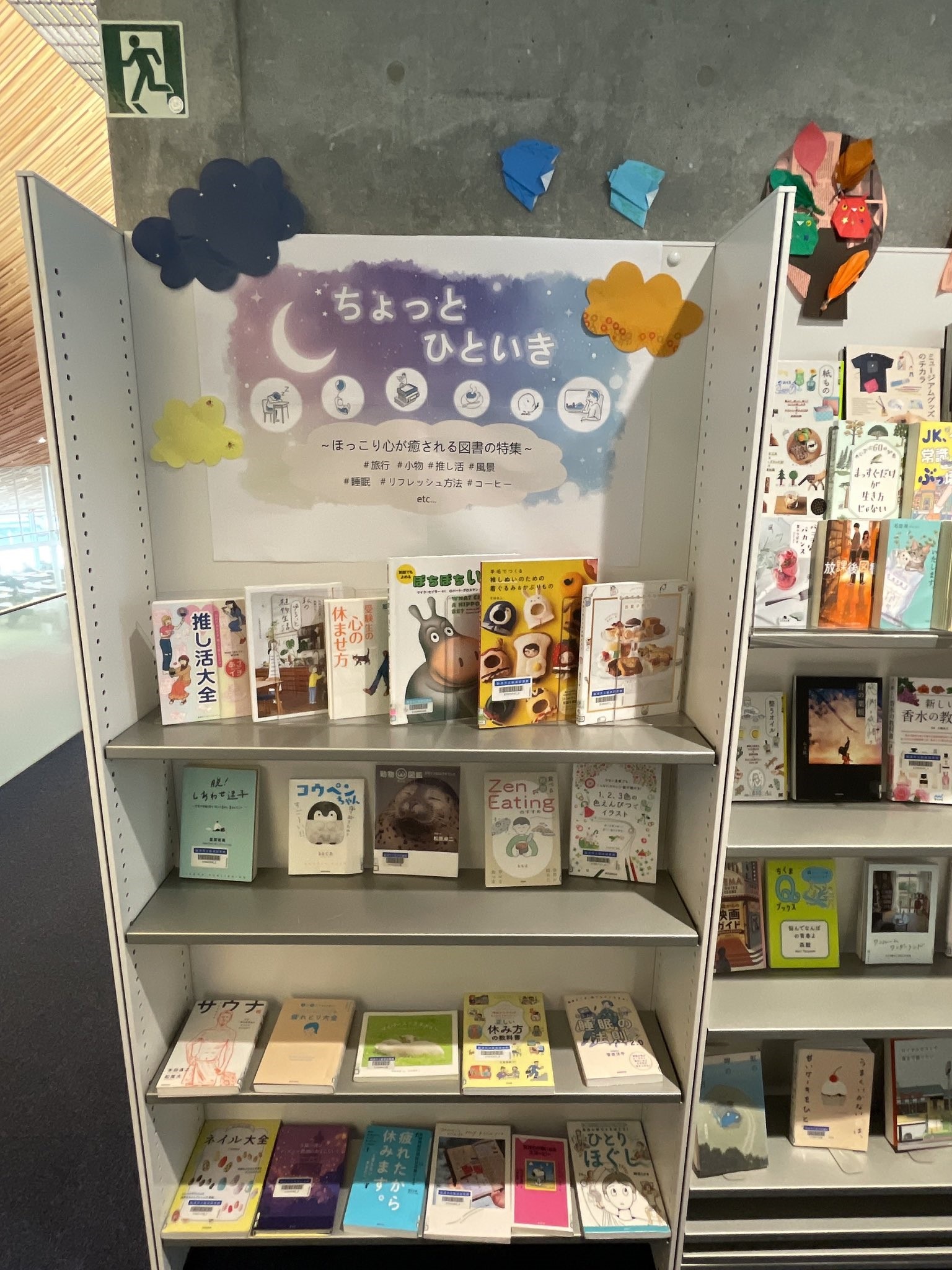 ラ・ラ・ラ・ライブラリー 砺波市立図書館 【企画展示】「ちょっと ひといき」 @砺波図書館 2026年01月23日 16:56 企画展示・おすすめ図書 10代・20代の人々に向けた、2階の棚1の特集コーナーを入れ替えました。 今回のテーマは「ちょっとひといき」です。 寒い時期は図書館やおうちでほっこり読書を楽しんでみませんか? 睡眠について、コーヒータイムの楽しみ方、ハートフルなイラスト・小物について書かれた本など リフレッシュ方法になるような本たちを集めました☕🌜📚 ぜひ学習の息抜きに覗いてみてください✨ 貸出は1階の自動貸出機でお願いします。 ツイート 前の記事次の記事