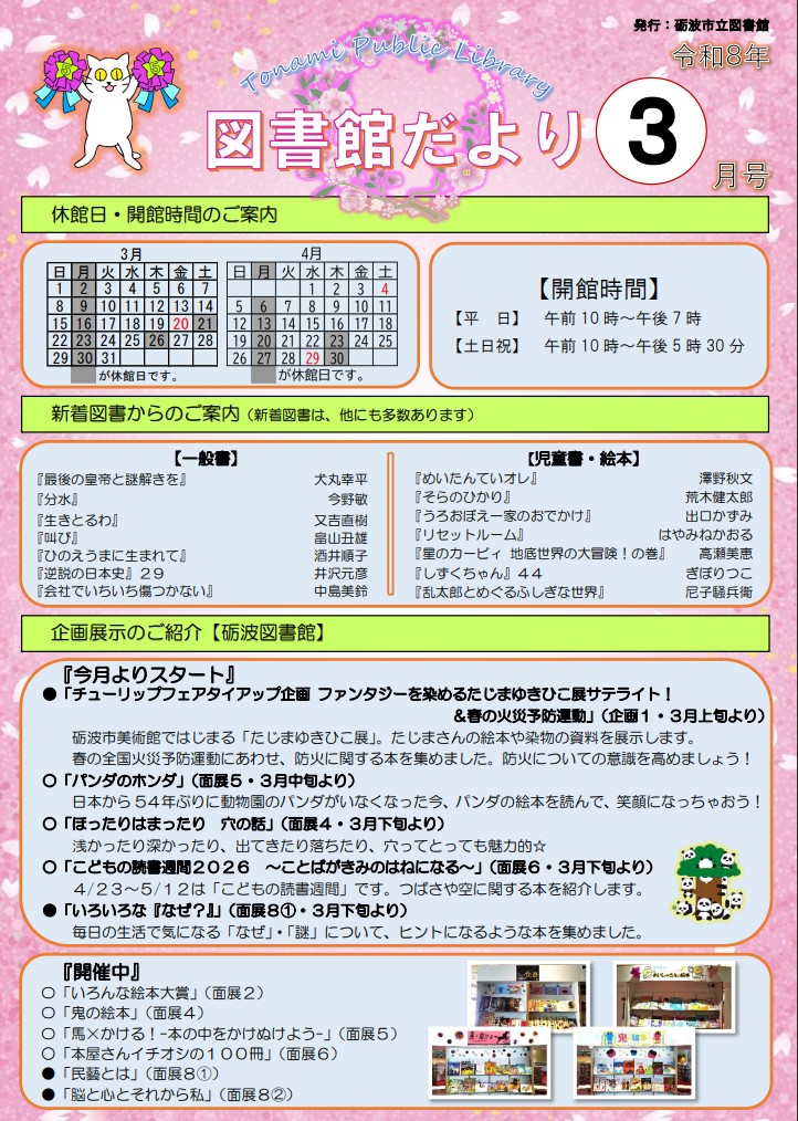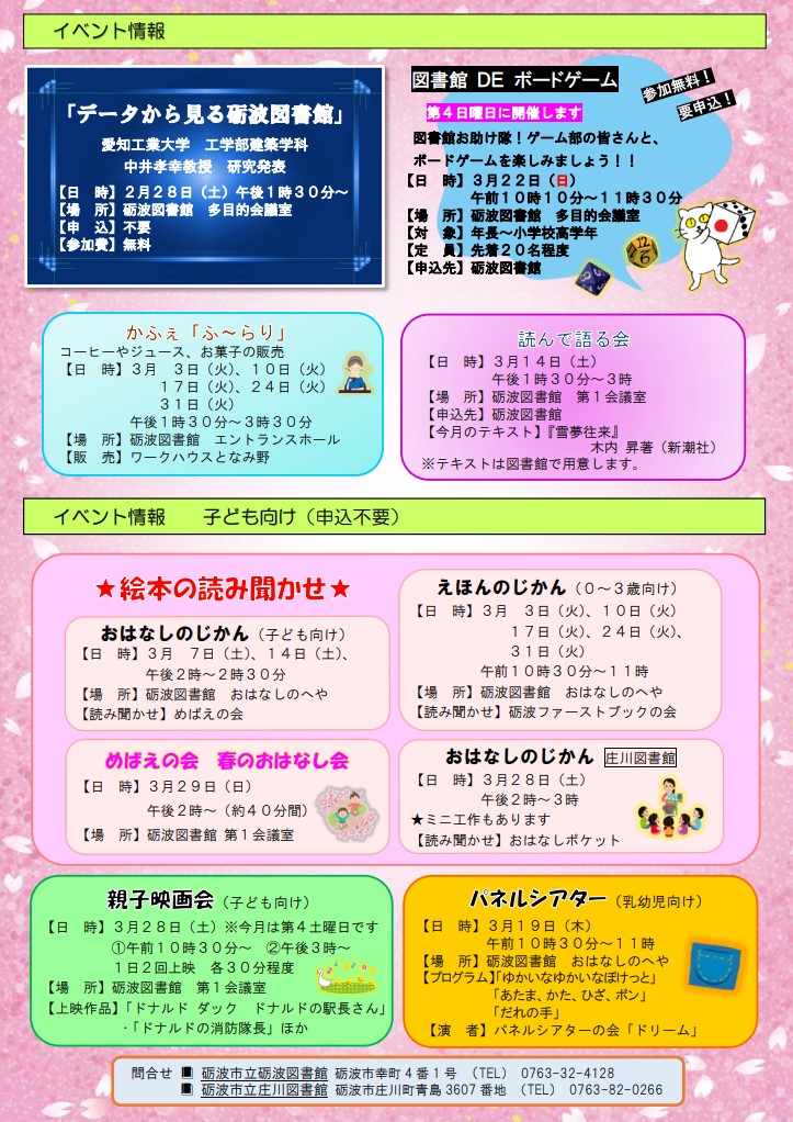 | 日 時:3月22日(日) 午前10時10分~11時30分 場 所:砺波図書館 多目的会議室 対 象:年長~小学校高学年 申 込:必要 申込先:砺波図書館(先着20名程度) 参加費:無料 |