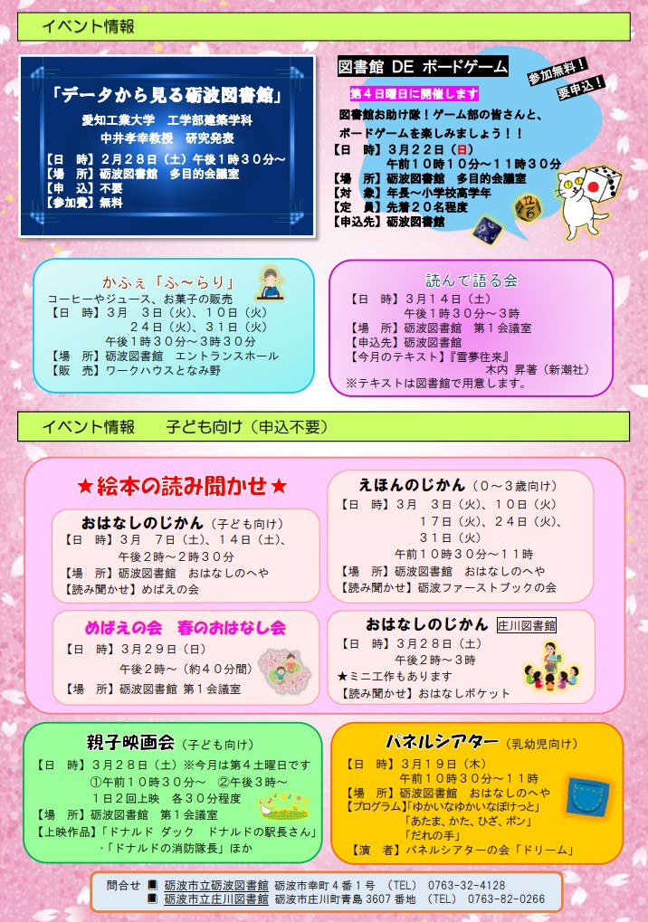 | 日 時:3月22日(日) 午前10時10分~11時30分 場 所:砺波図書館 多目的会議室 対 象:年長~小学校高学年 申 込:必要 申込先:砺波図書館(先着20名程度) 参加費:無料 |