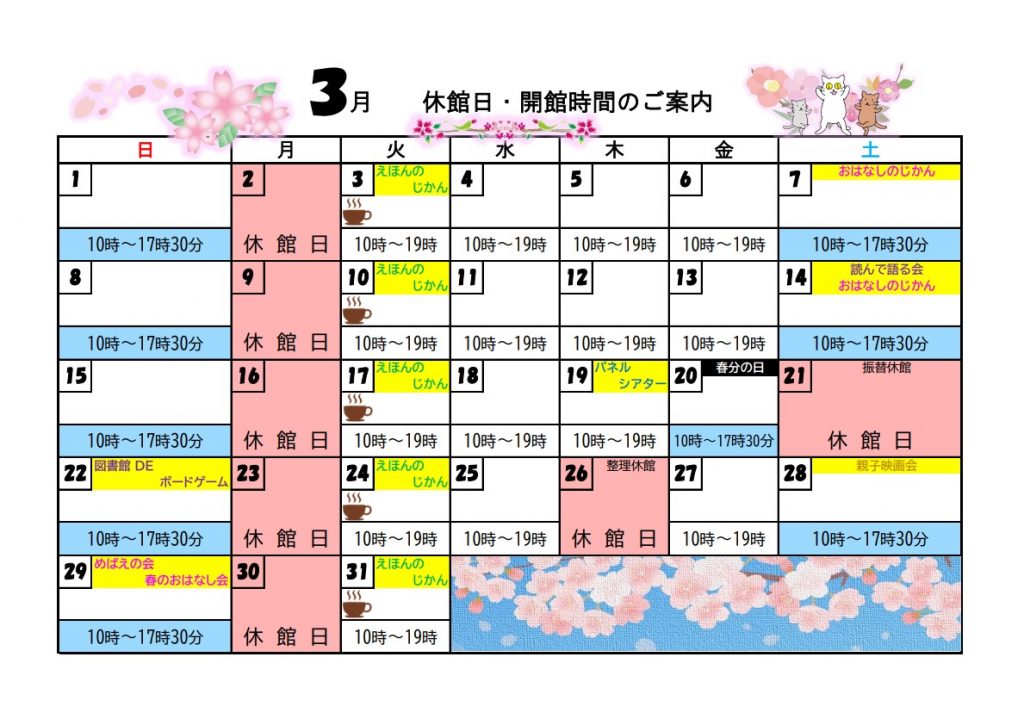 | 日 時:3月 7日(土) 午後2時~2時30分 (30分) 3月14日(土) 午後2時~2時30分 (30分) 場 所:砺波図書館 おはなしのへや ☆めばえの会 春のおはなし会 日 時:3月29日(土) 午後2時~(40分程度) 場 所:砺波図書館 第1会議室 ★めばえの会さんによる、幼児向けの読み聞かせです。 |
