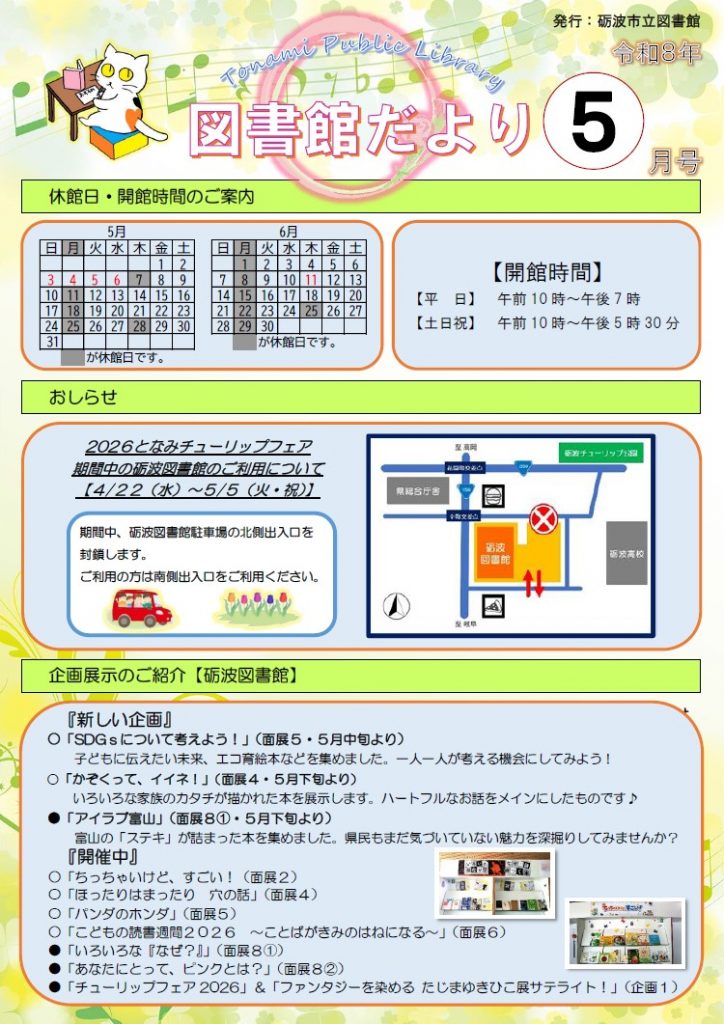| 日 時:5月30日(土) 午後1時30分~3時30分 場 所:砺波図書館 多目的会議室 定 員:100名(申込不要) 参加費:入場無料・出入り自由 ※駐車場は富山県砺波総合庁舎をご利用ください |